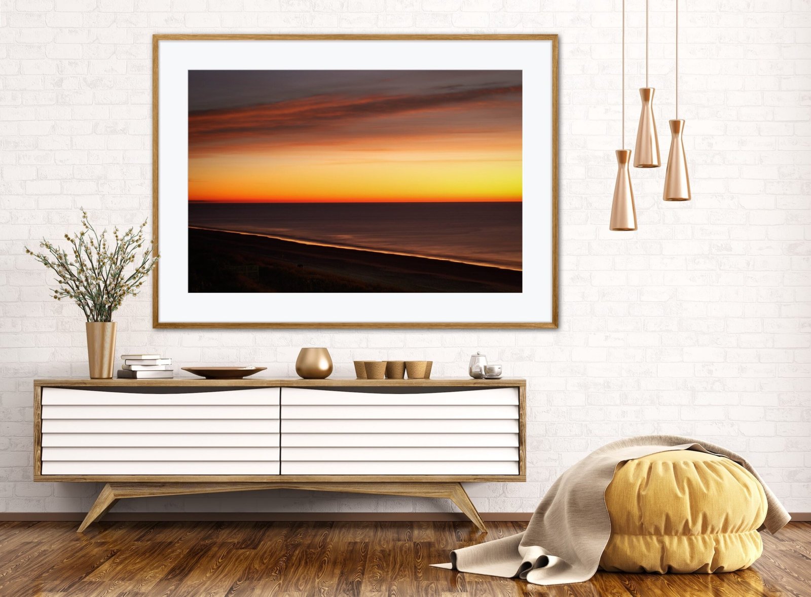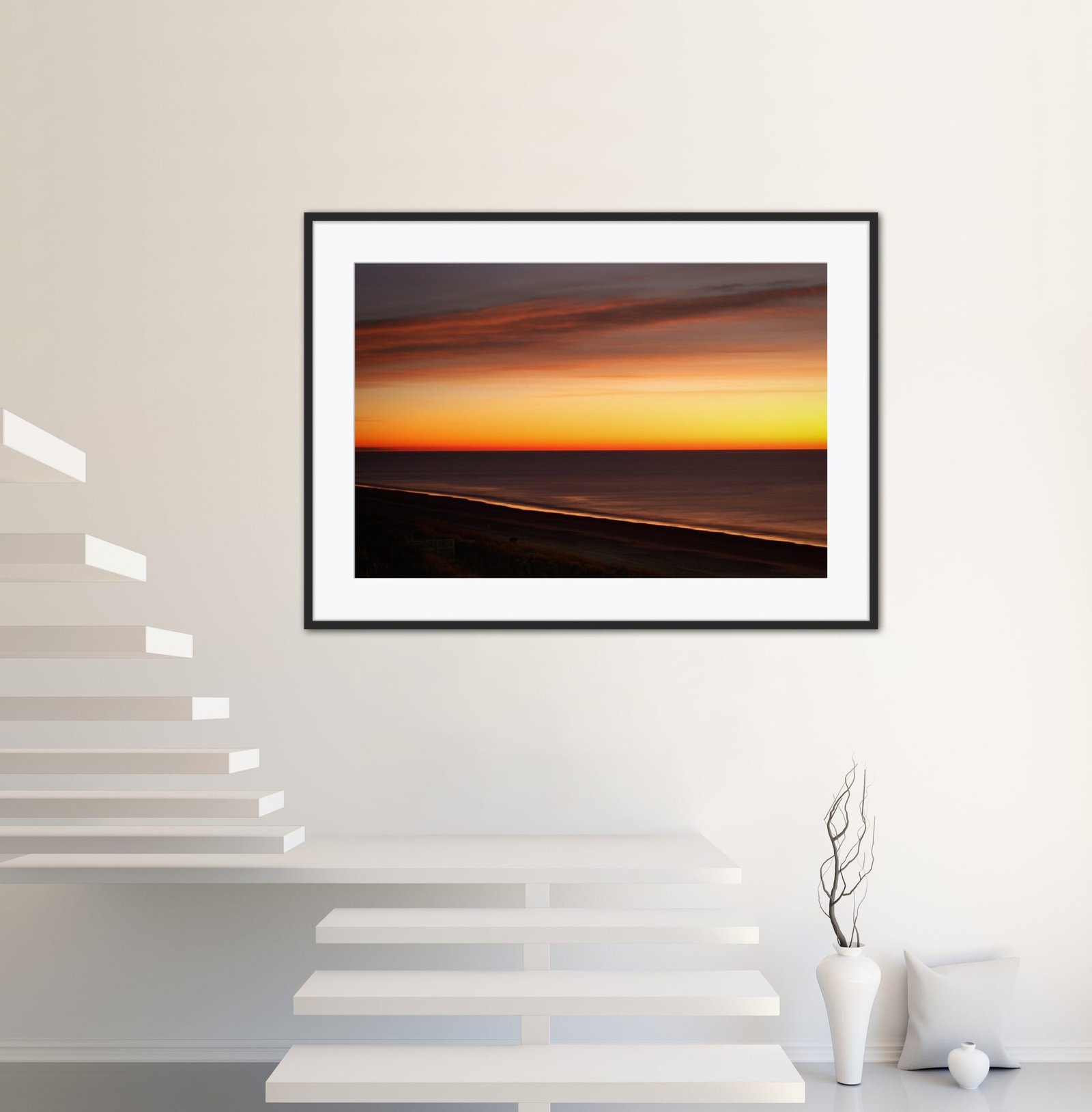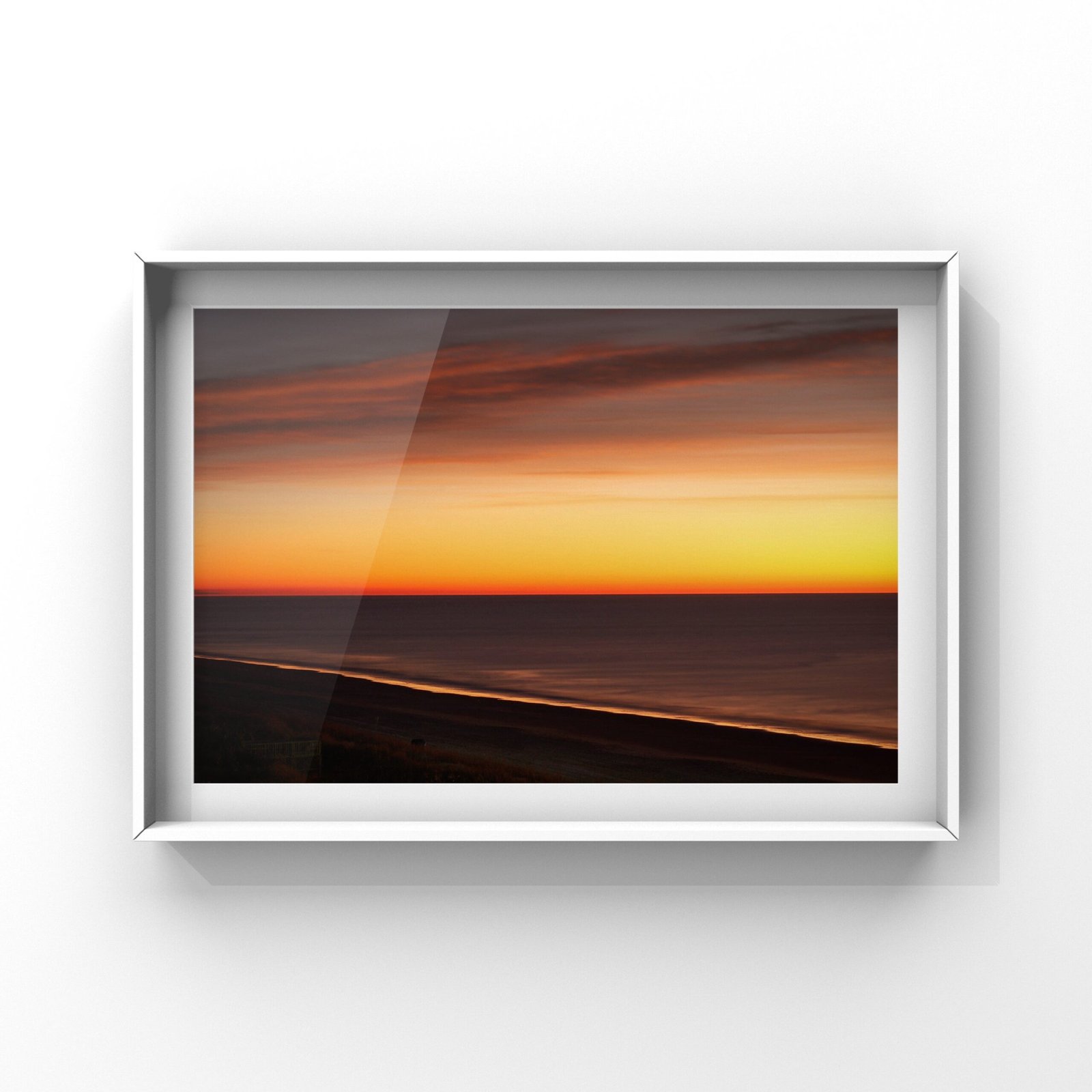 A radiant beach sunrise bursting with color and calm — captured in one peaceful, minimalist photo print.